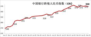 1月29日,中國銀行發(fā)佈2025年四季度跨境人民幣指數(shù)(CRI)。四季度CRI指數(shù)爲368,較上季度上回落4點。