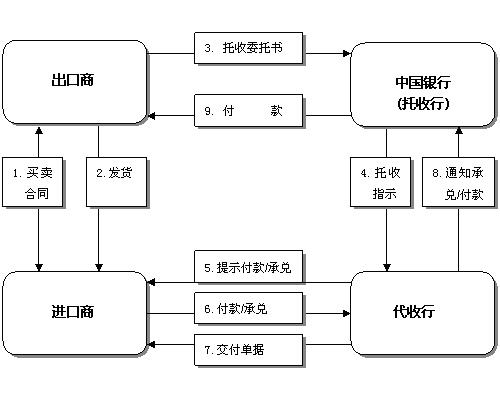 中國銀行(加拿大)受出口商委托,憑其提交的出口商業(yè)單據(jù)和金融票據(jù)通過代收行向進口商收取款項。