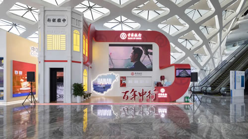 到達(dá)登錄廳,首先可以來“百年中行品牌形象展區(qū)”逛逛。在延續(xù)首屆消博會吸睛無數(shù)的復(fù)古騎樓造型基礎(chǔ)上,進(jìn)一步加入高科技元素,體現(xiàn)百年來傳統(tǒng)與現(xiàn)代的交融,中行紅的絲綢連接古今,從海上絲綢之路到海南自貿(mào)港建設(shè),中行一直都在。