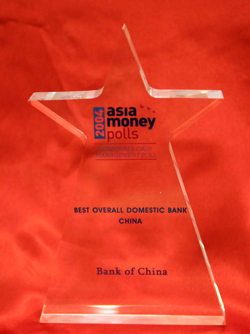 In June 2004 issue of the Asiamoney, Bank of China was named as the "Best Overall Domestic Bank, China" from the Corporate Cash Management Poll.