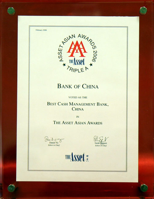 In a 2006 issue of the Asset, Bank of China was voted as the "Best Cash Management Bank, China".