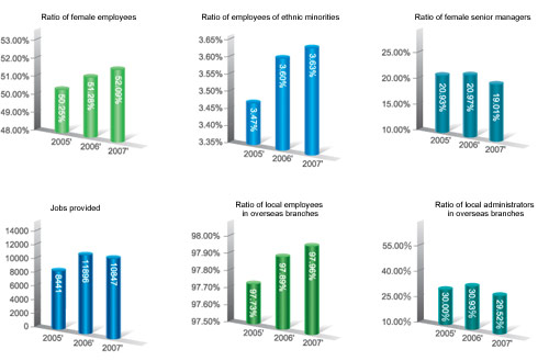 Based on its business development needs, Bank of China has been providing job opportunities by employing fresh graduates and overseas returnees, and through social recruitment. From 2005 to 2007, the bank had provided 8,441,11,896 and 10,847 jobs to the society respectively with the number of newly recruited workforce rising every year; and the salary of new staff is higher than the average level of the society. Hence, the Bank was awarded the title of "The Best Employer" by the authorities for two consecutive years. During the joint-stock reform, the Bank has been generally praised for insisting on the "no massive downsizing" policy. Its overseas branches have long been upholding the "localization" recruitment principle with the ratio of local employees exceeding 97%. Labor unions have been set up in the head office and branches to protect employees' legitimate rights and interests as well as democratic rights through participation in the Bank's democratic management on behalf of employees. While entering into labor contracts with employees, the Bank has strictly conformed to the relevant laws and regulations issued by the State on working hours, i.e. no more than 8 hours a day and 40 hours a week. In case of overtime work, the Bank will assume the additional payment. According to the relevant regulations of the State and the Bank, Bank of China's employees are entitled to all kinds of welfares, like regular medical examination and the rights of rest and leisure. The Bank has drafted the Interim Procedures on Labor Protection of Female Employees, and abided by the State regulations on prohibition of use of child labor.