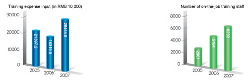 In cooperation with Peking University, Tsinghua University, Shanghai University of Finance and Economics, City University London, the University of Illinois and other colleges, Bank of China has strived to strengthen the administrators' leadership, encouraged and funded the staff to take disciplinary courses in the spare time. The Bank has been increasing the input into staff training each year. As of 2007, 6,232 employees from various branches had been involved in the on-the-job training, the expenses of which had amounted to RMB 284,448,000.