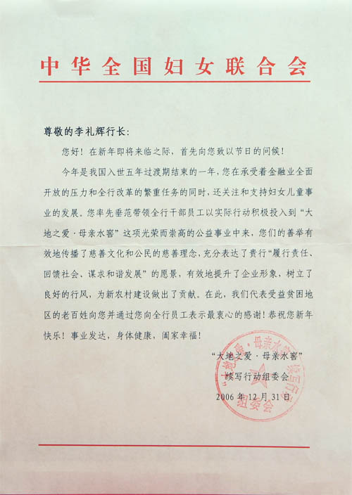 This year marks the end of the five-year transition period of China' s entry into WTO. While under pressure from overall opening up of the financial industry and the heavy task of the bank's reform, you are still caring about and supporting the development of the undertakings for women and children. Under your leadership, all management and employees of your bank actively participated in the honorable commonweal project - "Love of the Earth, Water Cellars for Mothers". Your benevolent actions not only effectively promote the charity culture and citizens' charity concept but also fully show your bank's perspective of "fulfillment of responsibilities, commitment to society and pursuit of harmonious development", gaining a better enterprise image, forming excellent corporate culture, and making remarkable contributions to the New Countryside construction. On behalf of the benefited people in the poverty-stricken areas, we hereby to express our deep gratitude to you and your staff! Wish you a Happy New Year! All the best to you and your family!