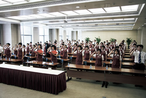 Bank of China's employees taking an oath before leaving for the temporary Olympic service outlets.