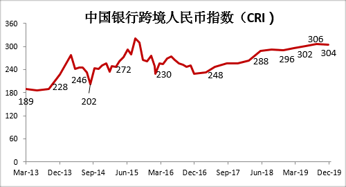 中國銀行發(fā)布2019年四季度跨境人民幣指數(CRI)。結果顯示,四季度CRI指數為304,較三季度回落2點,高于預測值4點。