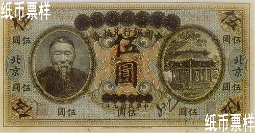 | 李鴻章像兌換券 | 伍圓 | 北京 | 正面左為李鴻章像;右為重檐八角亭圖;背面北京頤和園萬(wàn)壽山圖 | 藍(lán)、黑 | 94×176 | 美國(guó)鈔票公司 | 正面為“民國(guó)元年”背面為“1 st OCTOBER 1909” |