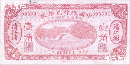 | 國幣輔幣兌換券 | 貳角 | 清江浦 | 正面為北京頤和園萬壽山圖;背面為花紋圖案 | 63×119 | 財(cái)政部印刷局 | 正面為“民國六年十月”背面為“OCTOBER 1 st 1917” |