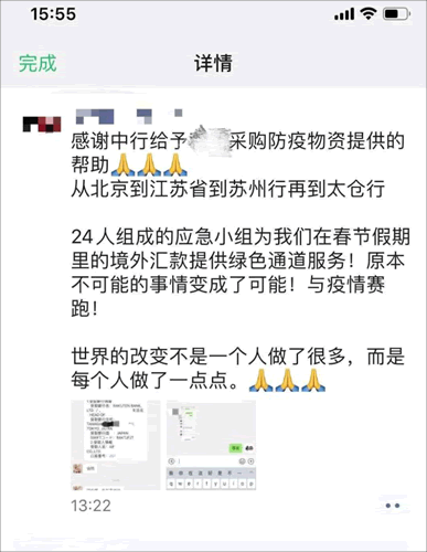 圖為客戶在朋友圈向中行表示感謝