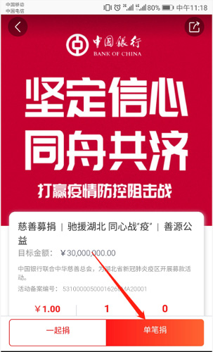 登錄“公益中國(guó)”APP——選擇中國(guó)銀行“堅(jiān)定信心,同舟共濟(jì)”圖片,點(diǎn)擊進(jìn)入活動(dòng)頁(yè)面——選擇“單筆捐”進(jìn)入支付頁(yè)面——輸入金額,選擇支付方式——完成支付。