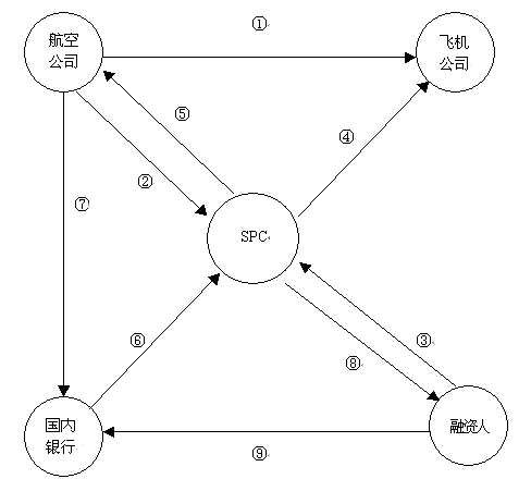 3.融資人按照購機協(xié)議中的價格向SPC提供全額融資,一般是由歐、美出口信貸機構(gòu)提供融資擔保的出口信貸(80%--85%),輔以部份商業(yè)銀行貸款組成的銀團貸款;