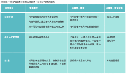 下表是在境內(nèi)母公司擔(dān)保的情況下,企業(yè)境外機構(gòu)在當(dāng)?shù)厣暾堎J款與使用我行全球統(tǒng)一授信產(chǎn)品對應(yīng)的操作模式的對比: