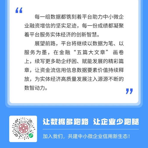 轉(zhuǎn)發(fā)“中國(guó)人民銀行征信中心”公眾號(hào)推文:全國(guó)中小微企業(yè)資金流信用信息共享平臺(tái)——“數(shù)”說(shuō)平臺(tái)“一周年”