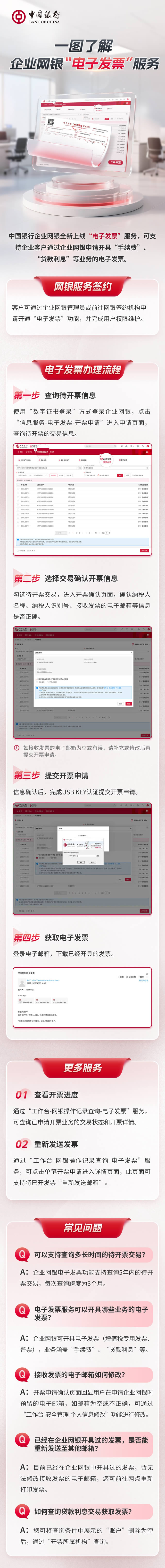 A:企業(yè)網(wǎng)銀可開(kāi)具電子發(fā)票(增值稅專(zhuān)用發(fā)票、普票),業(yè)務(wù)涵蓋“手續(xù)費(fèi)”、“貸款利息”等。