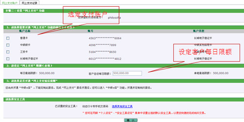 3、在您的網(wǎng)上銀行關(guān)聯(lián)賬戶中選定網(wǎng)銀支付賬戶,您可在銀行最大限額下設(shè)定客戶每日限額(您網(wǎng)上支付的交易限額還與商戶支持的卡類型及限額有關(guān),具體請(qǐng)參見商戶公告或頁(yè)面提示)。