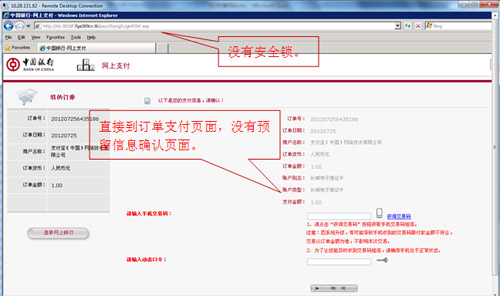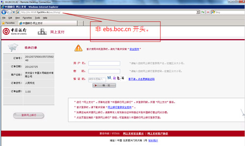 2、請(qǐng)仔細(xì)核對(duì)訂單號(hào)、訂單日期、訂單金額等關(guān)鍵信息,查驗(yàn)登錄頁(yè)瀏覽器地址欄后是否有“安全鎖”標(biāo)志。核對(duì)無(wú)誤后再登錄中國(guó)銀行網(wǎng)上銀行進(jìn)行支付。