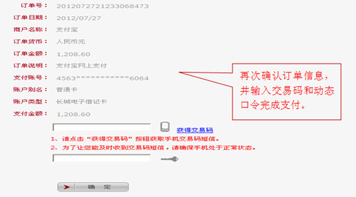 4、請(qǐng)?jiān)俅魏藢?duì)訂單信息,核對(duì)無(wú)誤后再輸入手機(jī)交易碼和動(dòng)態(tài)口令完成交易。如您持有二代USBKey,可將USBKey插入電腦完成交易簽名。