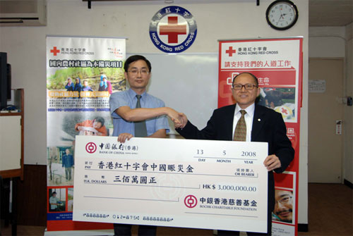 In the wake of the massive earthquake in Sichuan, BOCHK is the first Hong Kong institution to hand over donations to the Hong Kong Red Cross. By the afternoon of May 15, BOCHK has raised over HKD 6 million from its customers and the public via the disaster relief accounts set up on May 13, and nearly HKD 1 million from its 13,500 staff who made an immediate response to the appeal for donations by the Group.