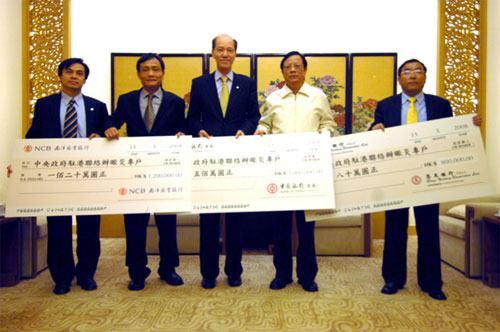Nanyang and Chiyu respectively, Lin Yannan (middle), Vice Chairman of BOCHK, Xu Gang (second from left), CEO of Nanyang, and Chen Yaohui (first from left), deputy general manager of Chiyu, presented a cheque of HKD 7 million to Zheng Kunsheng (second from right), deputy director of the Liaison Office of the Central People's Government in the Hong Kong S.A.R., and Wang Bingxin (first from right), director of Economic Affairs Department of the Liaison Office.