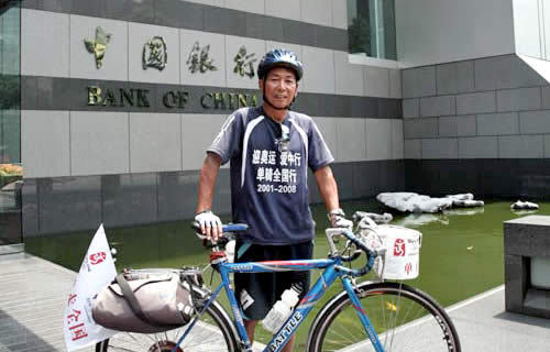Zhang Wannian, a 62-year old retired employee from Bank of China Fuxin Branch, had been publicizing Beijing Olympic Games by riding a bicycle across China on his own since Beijing won the bid for the Olympic Games in July 2001. For seven years he had travelled across more than 1,100 cities above county level in 32 provinces, autonomous regions and municipalities as well as Hong Kong and Macau Special Administrative Regions, covering the distance of 64,000 km. He had traversed T'ang-ku-la Mountains (5,231 m above sea level, marking the highest point of his tour), the extremely rugged Sichuan-Shaanxi passageway, Qinghai-Tibet Road on the oxygen-sparse and snow-topped plateau, the vast expanse of Gobi desert, the Taklimakan Desert - the sea of death, and the desolate grasslands in Inner Mongolia. On August 8, 2008, he arrived in Beijing with a banner stamped with seals of Bank of China's outlets he visited along his journey, and dedicated the support and blessings from staff of the Bank to Beijing Olympic Games.